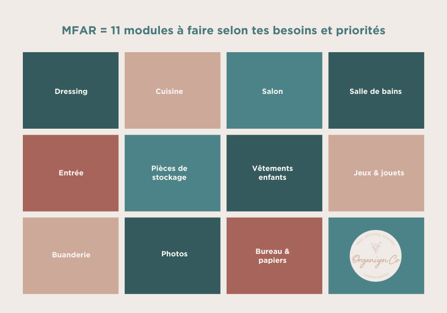 Tu avances à ton rythme et en fonction de TES priorités : dressing, cuisine, buanderie, salon, papiers, photos, jouets des enfants… Tu choisis par où commencer !